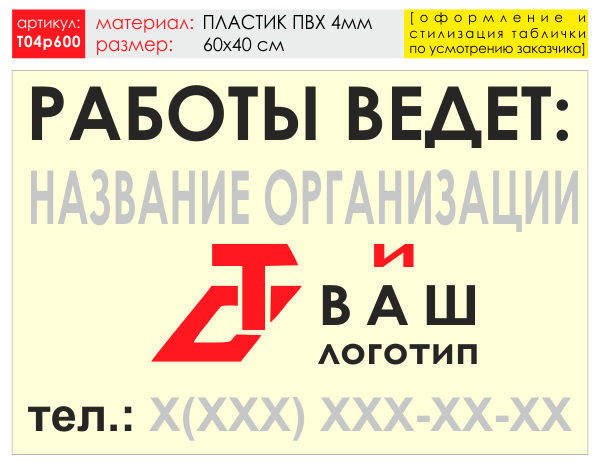 Баннер «Работы ведет», T04 (пластик 4 мм, 60х40 см) в Новом Уренгое купить