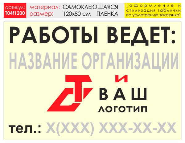 Баннер «Работы ведет», T04 (самоклеящаяся плёнка, 120х90 см) в Новом Уренгое купить