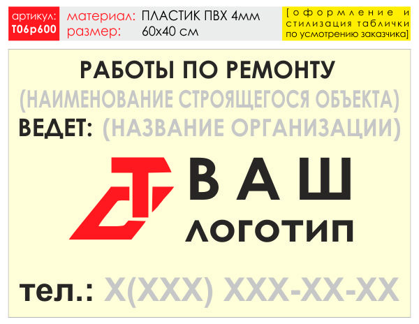 Баннер «Работы по ремонту», T06 (пластик 4 мм, 60х40 см) в Новом Уренгое купить