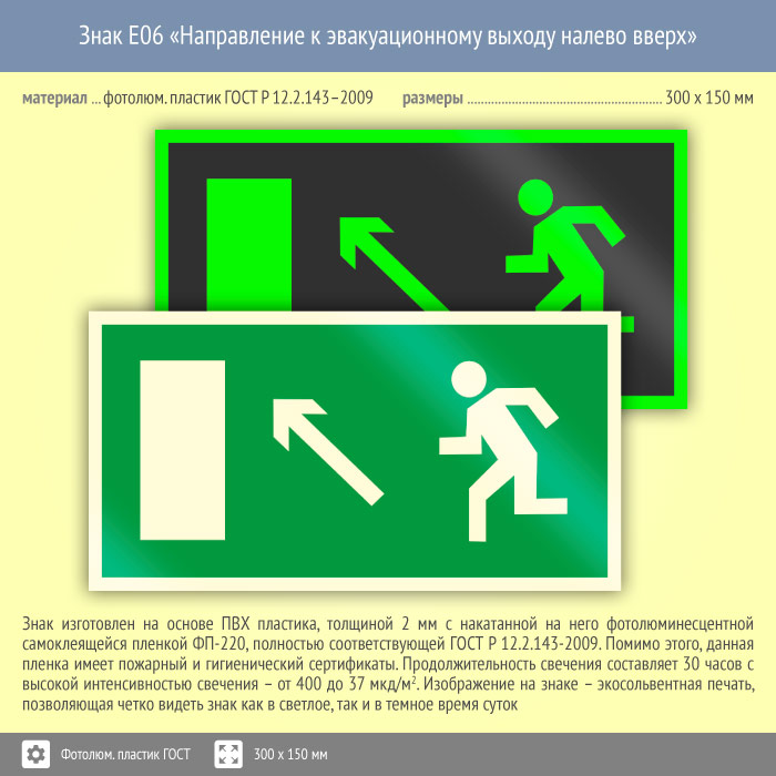 Знак E06 «Направление к эвакуационному выходу налево вверх» (фотолюминесцентный пластик ГОСТ 34428-2018, 300х150 мм) в Новом Уренгое купить