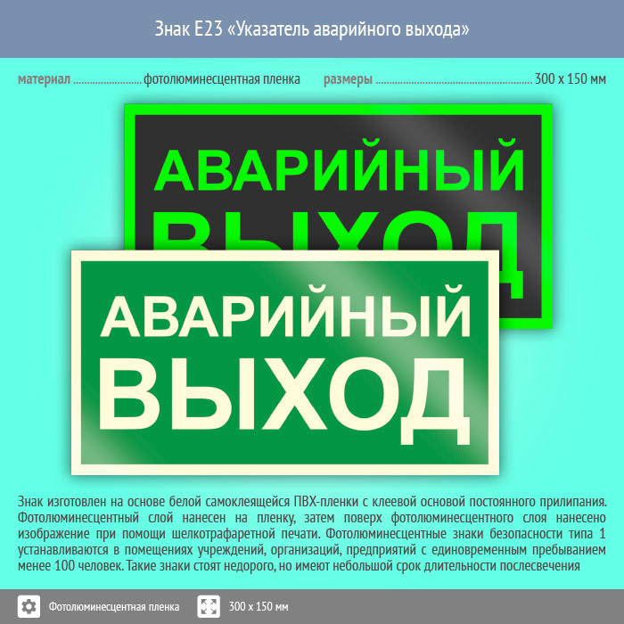 Знак E23 «Указатель аварийного выхода» (фотолюминесцентная пленка, 300х150 мм) в Новом Уренгое купить