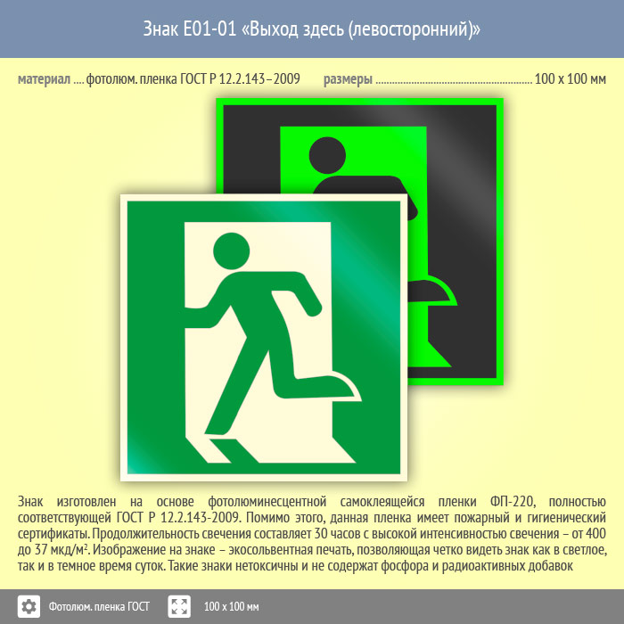 Знак E01-01 «Выход здесь (левосторонний)» (фотолюминесцентная пленка ГОСТ 34428-2018, 100х100 мм) в Новом Уренгое купить