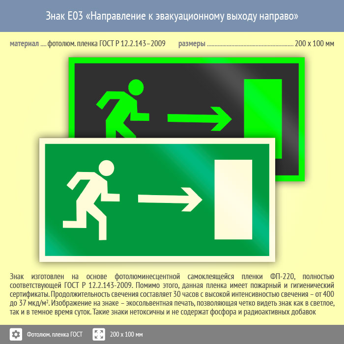 Знак E03 «Направление к эвакуационному выходу направо» (фотолюминесцентная пленка ГОСТ 34428-2018, 200х100 мм) в Новом Уренгое купить