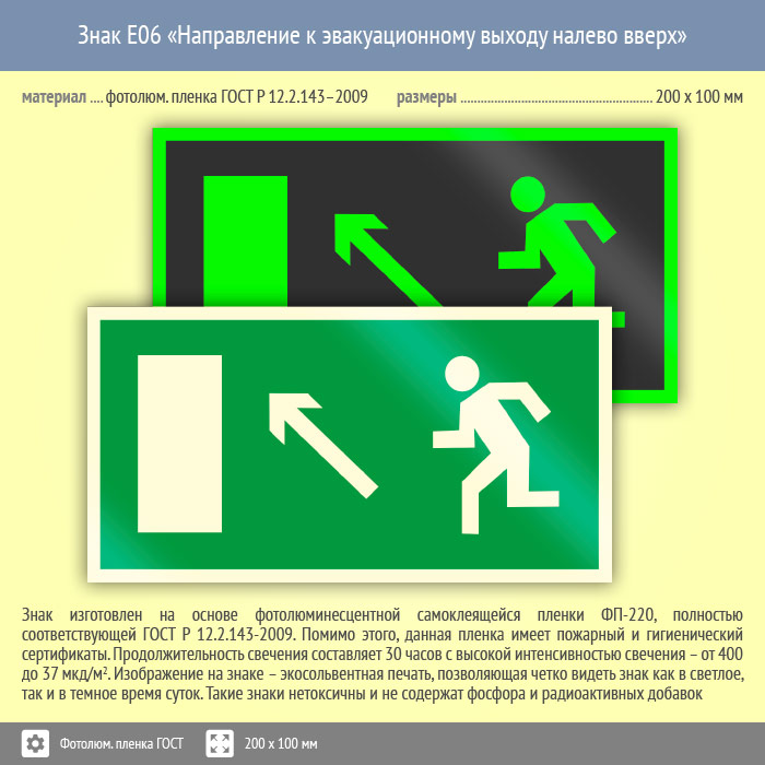 Знак E06 «Направление к эвакуационному выходу налево вверх» (фотолюминесцентная пленка ГОСТ 34428-2018, 200х100 мм) в Новом Уренгое купить