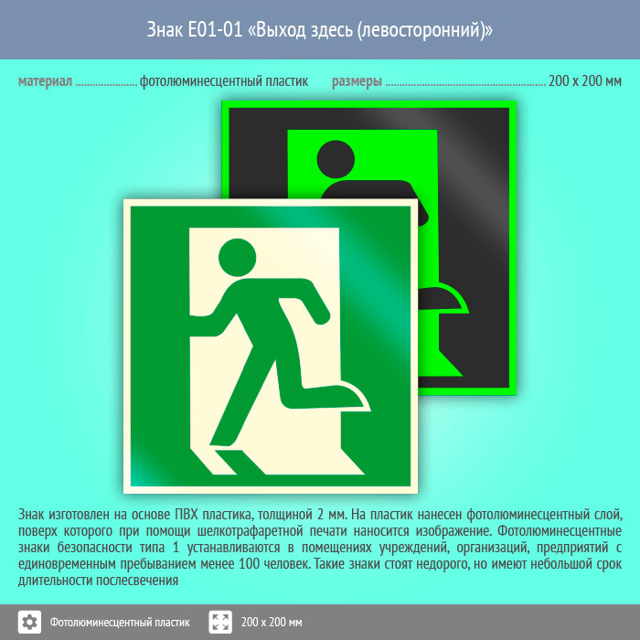 Знак E01-01 «Выход здесь (левосторонний)» (фотолюминесцентный пластик, 200х200 мм) в Новом Уренгое купить