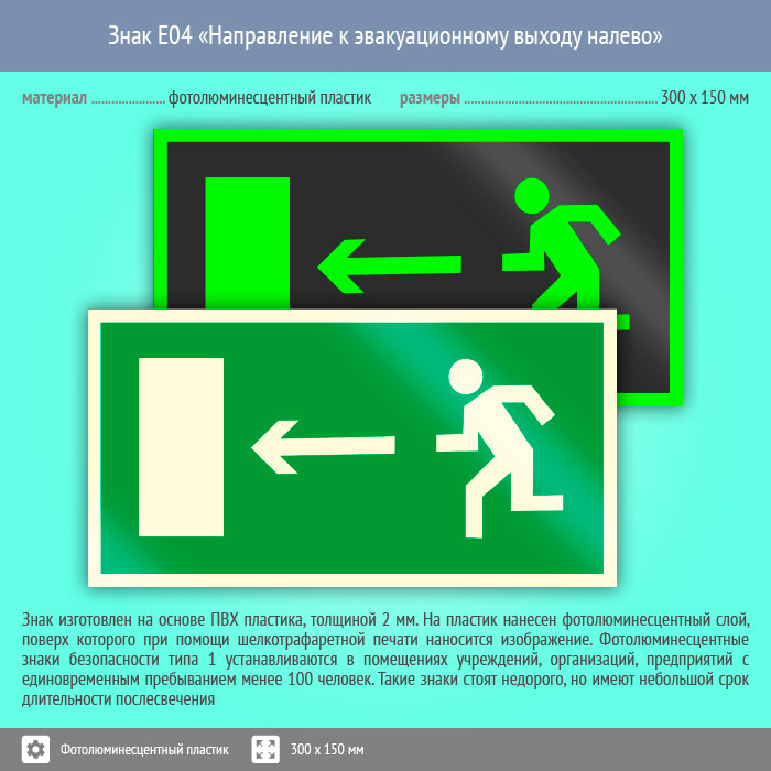 Знак E04 «Направление к эвакуационному выходу налево» (фотолюминесцентный пластик, 300х150 мм) в Новом Уренгое купить
