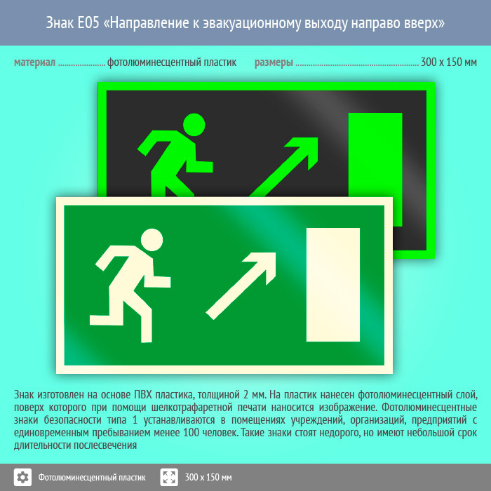 Знак E05 «Направление к эвакуационному выходу направо вверх» (фотолюминесцентный пластик, 300х150 мм) в Новом Уренгое купить