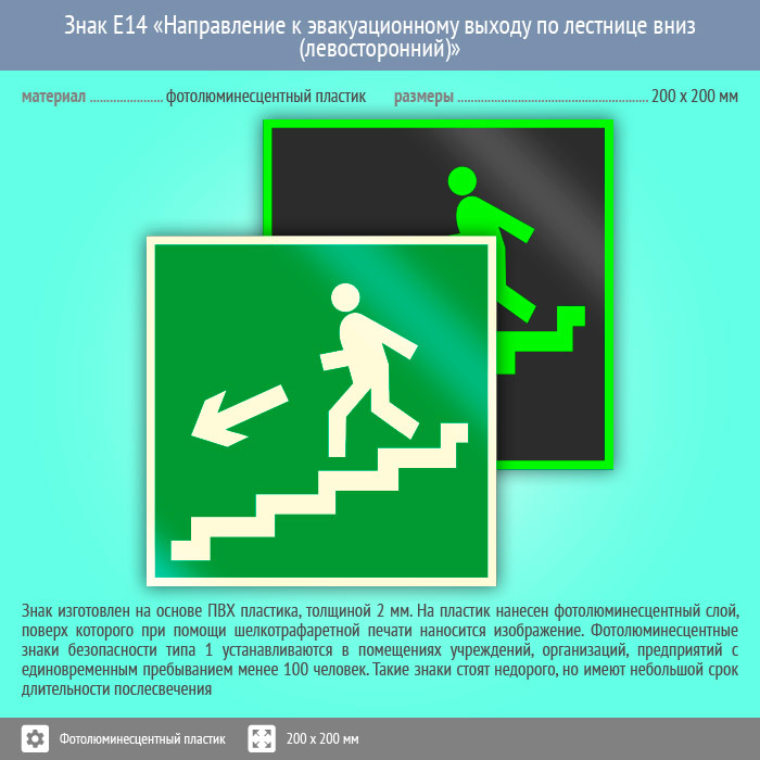 Знак E14 «Направление к эвакуационному выходу по лестнице вниз (левосторонний)» (фотолюминесцентный пластик, 200х200 мм) в Новом Уренгое купить