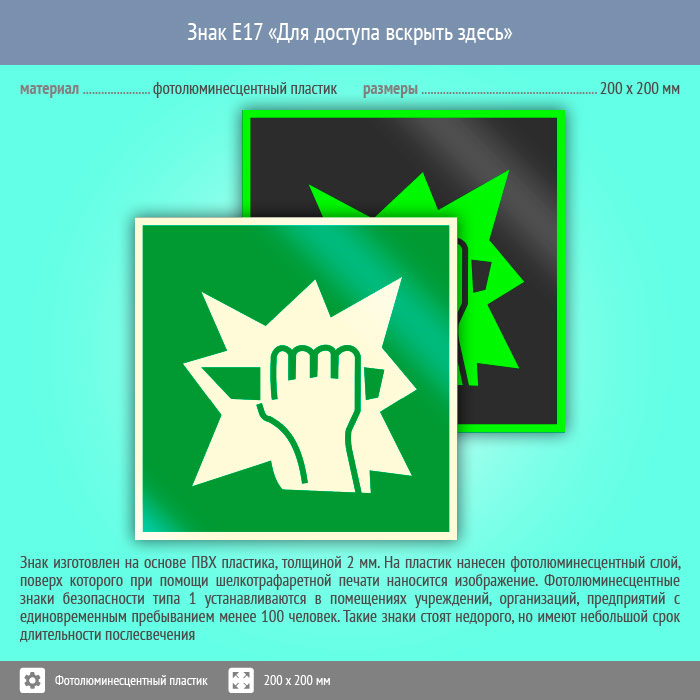 Знак E17 «Для доступа вскрыть здесь» (фотолюминесцентный пластик, 200х200 мм) в Новом Уренгое купить