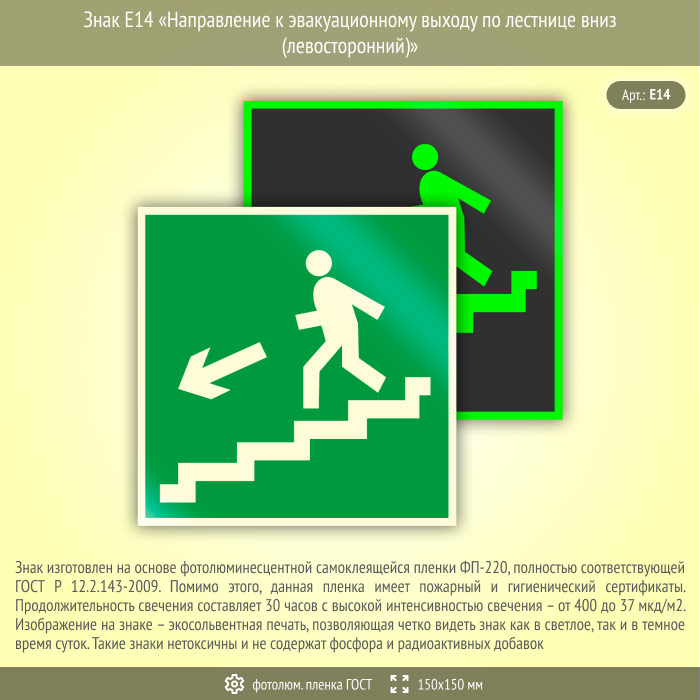 Знак E14 «Направление к эвакуационному выходу по лестнице вниз (левосторонний)» (фотолюминесцентная пленка ГОСТ 34428-2018, 150х150 мм) в Новом Уренгое купить