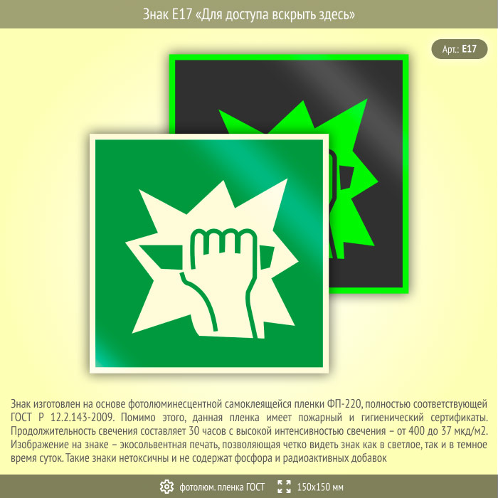 Знак E17 «Для доступа вскрыть здесь» (фотолюминесцентная пленка ГОСТ 34428-2018, 150х150 мм) в Новом Уренгое купить