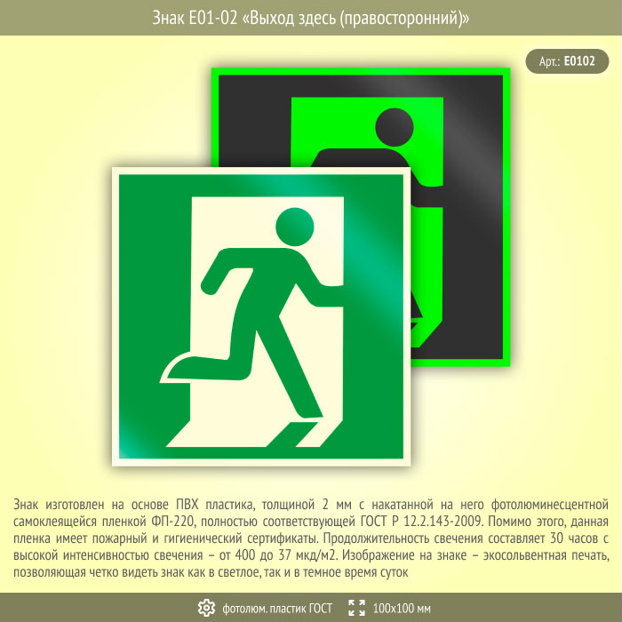 Знак E01-02 «Выход здесь (правосторонний)» (фотолюминесцентный пластик ГОСТ 34428-2018, 100х100 мм) в Новом Уренгое купить