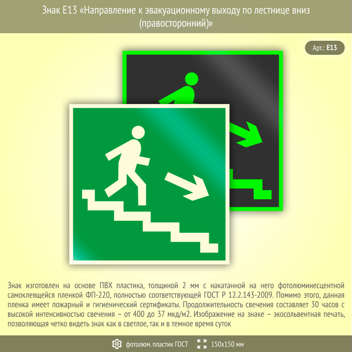 Знак E13 «Направление к эвакуационному выходу по лестнице вниз (правосторонний)» (фотолюминесцентный пластик ГОСТ 34428-2018, 150х150 мм) в Новом Уренгое купить