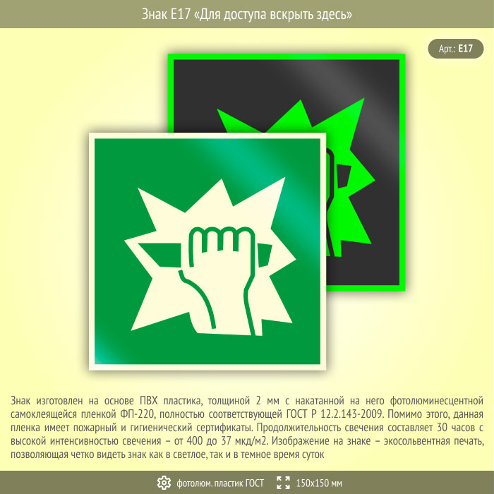Знак E17 «Для доступа вскрыть здесь» (фотолюминесцентный пластик ГОСТ 34428-2018, 150х150 мм) в Новом Уренгое купить