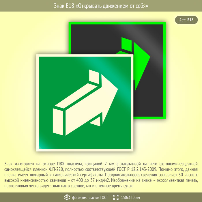 Знак E18 «Открывать движением от себя» (фотолюминесцентный пластик ГОСТ 34428-2018, 150х150 мм) в Новом Уренгое купить
