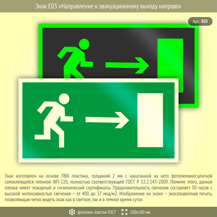 Знак E03 «Направление к эвакуационному выходу направо» (фотолюминесцентный пластик ГОСТ 34428-2018, 200х100 мм) в Новом Уренгое купить