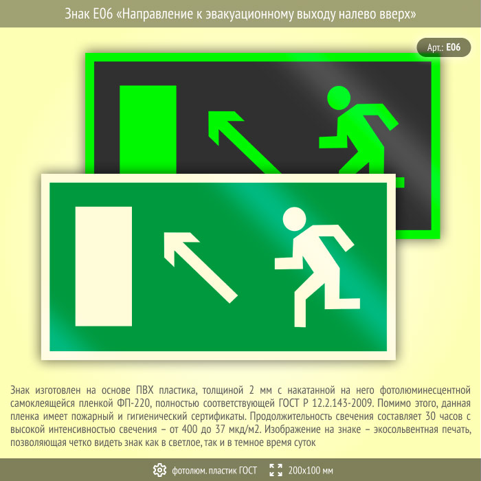 Знак E06 «Направление к эвакуационному выходу налево вверх» (фотолюминесцентный пластик ГОСТ 34428-2018, 200х100 мм) в Новом Уренгое купить