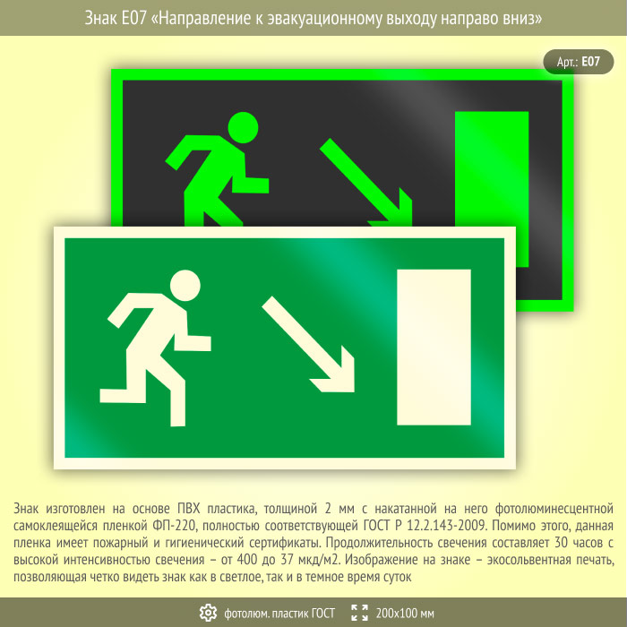 Знак E07 «Направление к эвакуационному выходу направо вниз» (фотолюминесцентный пластик ГОСТ 34428-2018, 200х100 мм) в Новом Уренгое купить