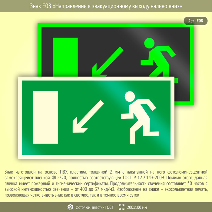 Знак E08 «Направление к эвакуационному выходу налево вниз» (фотолюминесцентный пластик ГОСТ 34428-2018, 200х100 мм) в Новом Уренгое купить
