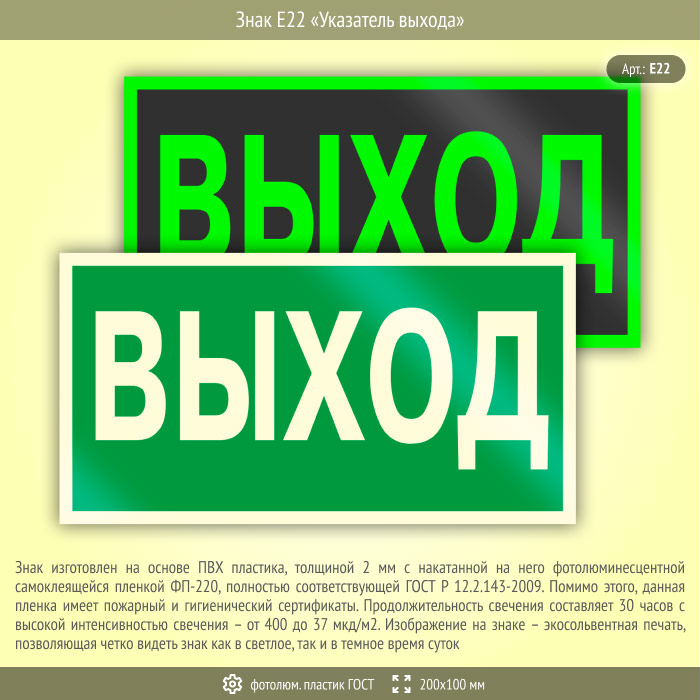 Знак E22 «Указатель выхода» (фотолюминесцентный пластик ГОСТ 34428-2018, 200х100 мм) в Новом Уренгое купить