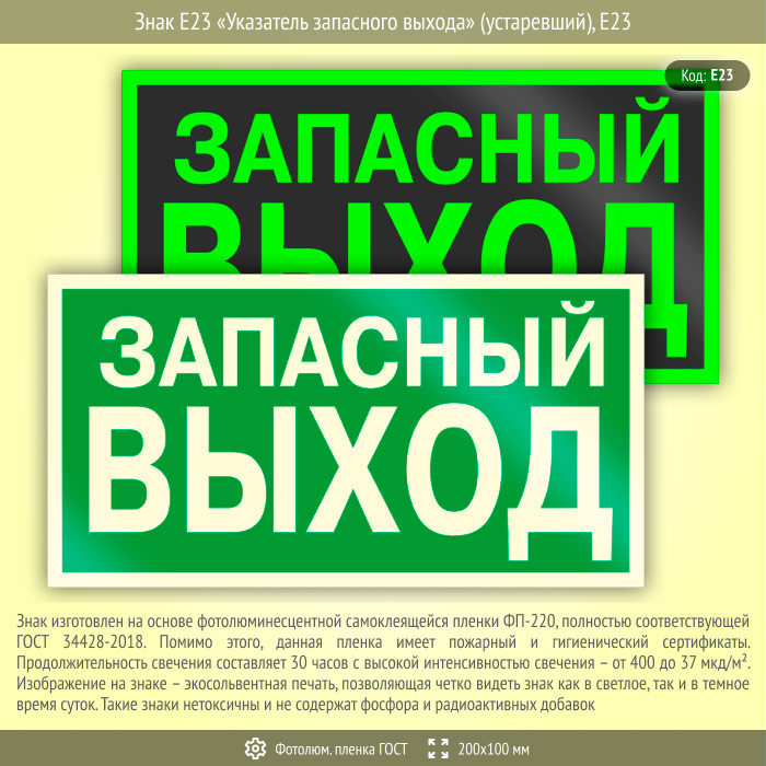 Знак E23 «Указатель запасного выхода» (устаревший) (фотолюминесцентная пленка ГОСТ 34428-2018, 200х100 мм) в Новом Уренгое купить