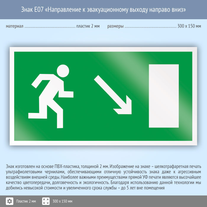 Знак E07 «Направление к эвакуационному выходу направо вниз» (пластик, 300х150 мм) в Новом Уренгое купить