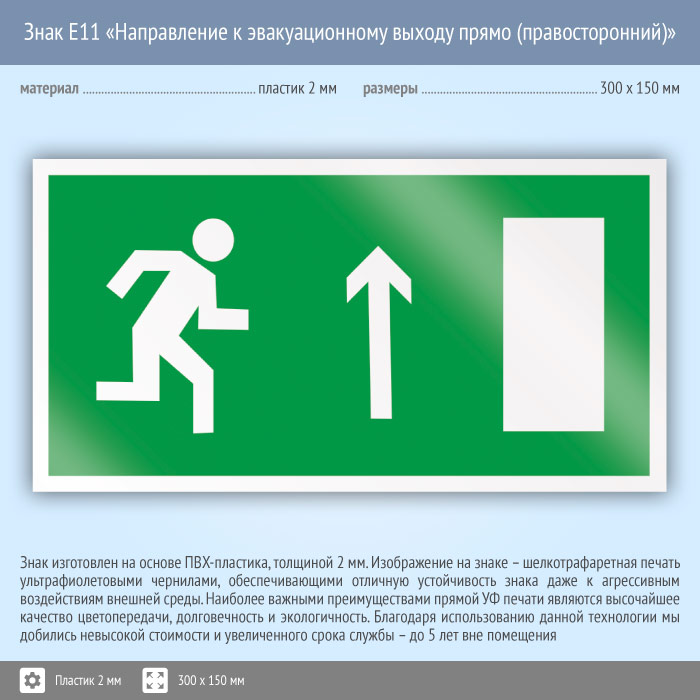 Знак E11 «Направление к эвакуационному выходу прямо (правосторонний)» (пластик, 300х150 мм) в Новом Уренгое купить