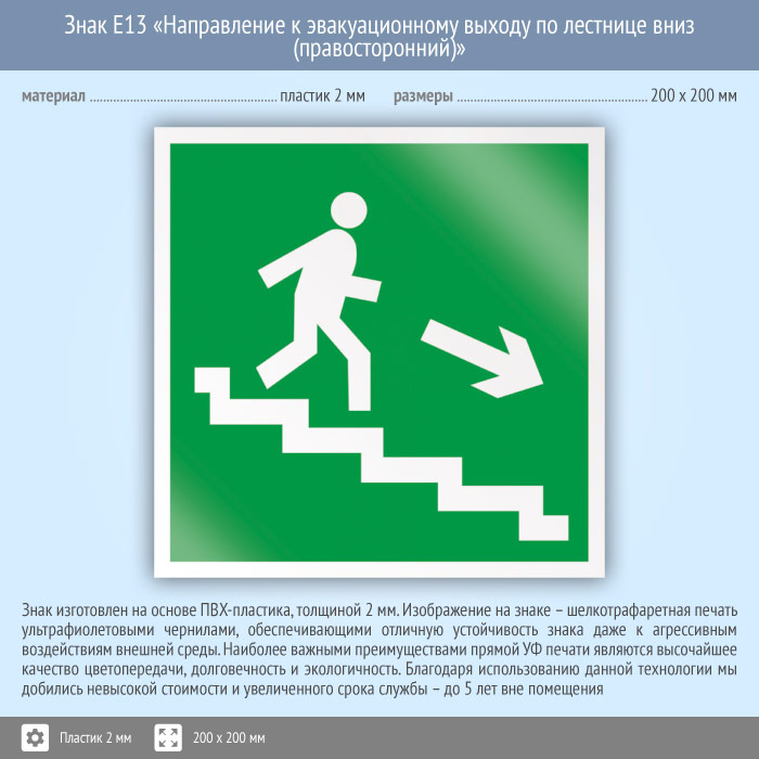 Знак E13 «Направление к эвакуационному выходу по лестнице вниз (правосторонний)» (пластик, 200х200 мм) в Новом Уренгое купить