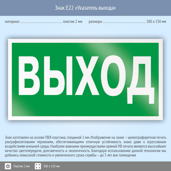 Знак E22 «Указатель выхода» (пластик, 300х150 мм) в Новом Уренгое купить