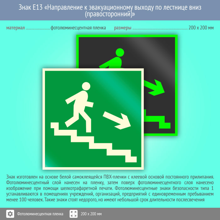 Знак E13 «Направление к эвакуационному выходу по лестнице вниз (правосторонний)» (фотолюминесцентная пленка, 200х200 мм) в Новом Уренгое купить