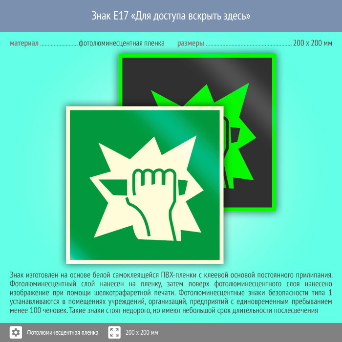 Знак E17 «Для доступа вскрыть здесь» (фотолюминесцентная пленка, 200х200 мм) в Новом Уренгое купить