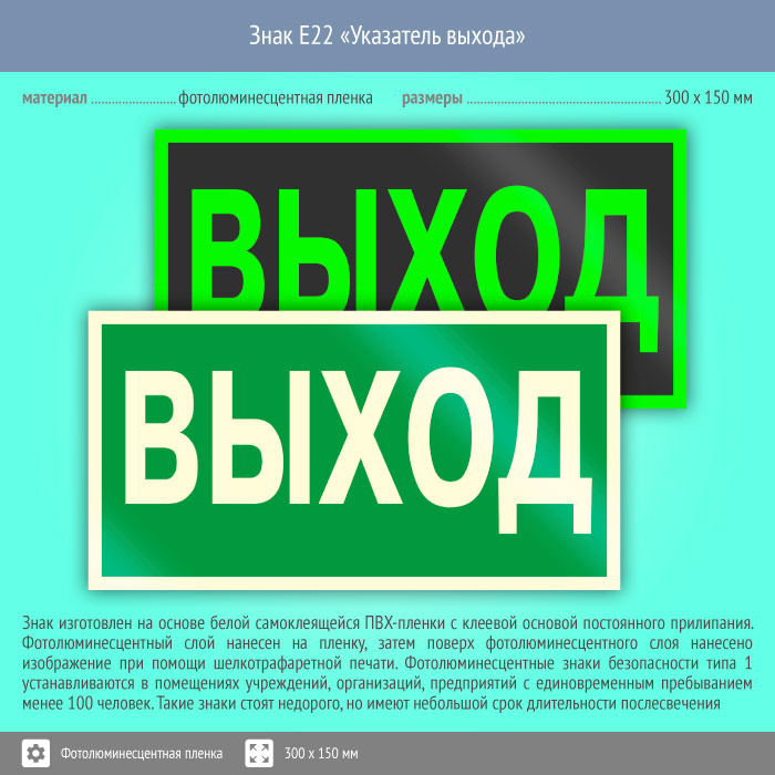 Знак E22 «Указатель выхода» (фотолюминесцентная пленка, 300х150 мм) в Новом Уренгое купить
