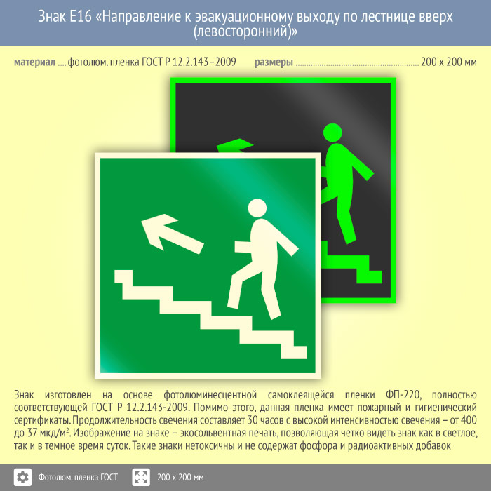 Знак E16 «Направление к эвакуационному выходу по лестнице вверх (левосторонний)» (фотолюминесцентная пленка ГОСТ 34428-2018, 200х200 мм) в Новом Уренгое купить