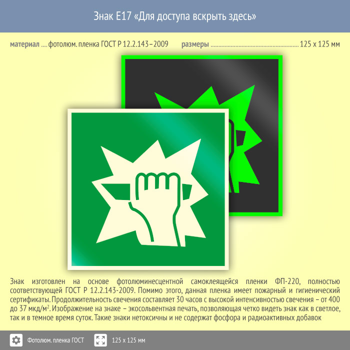 Знак E17 «Для доступа вскрыть здесь» (фотолюминесцентная пленка ГОСТ 34428-2018, 125х125 мм) в Новом Уренгое купить