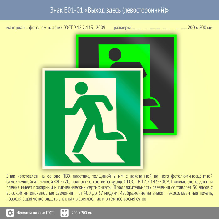 Знак E01-01 «Выход здесь (левосторонний)» (фотолюминесцентный пластик ГОСТ 34428-2018, 200х200 мм) в Новом Уренгое купить
