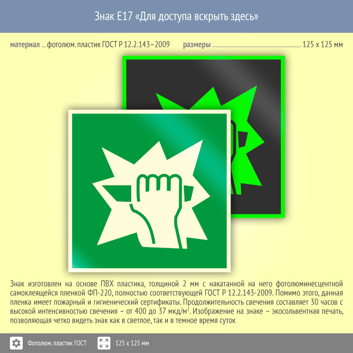Знак E17 «Для доступа вскрыть здесь» (фотолюминесцентный пластик ГОСТ 34428-2018, 125х125 мм) в Новом Уренгое купить