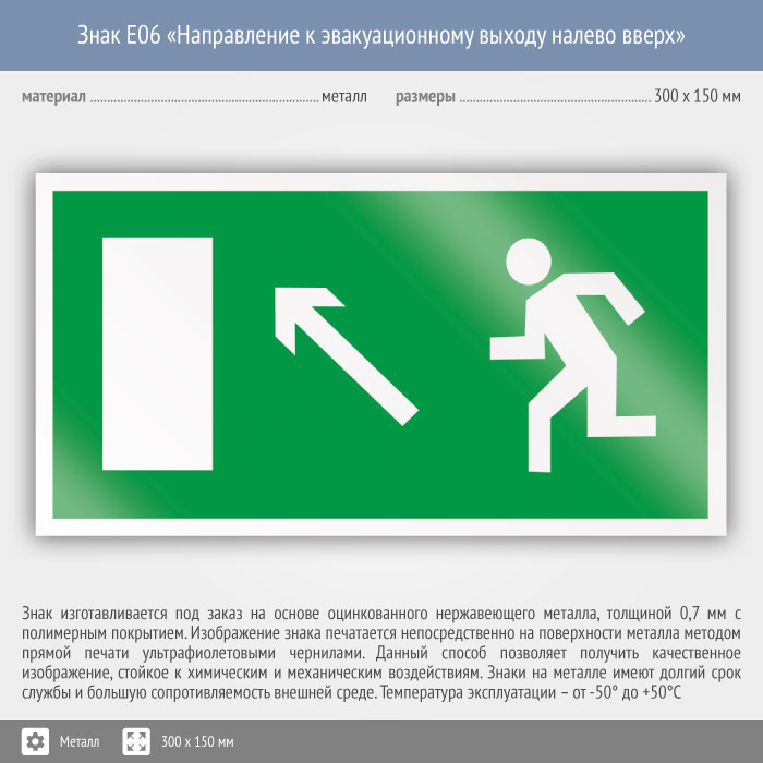 Знак E06 «Направление к эвакуационному выходу налево вверх» (металл, 300х150 мм) в Новом Уренгое купить