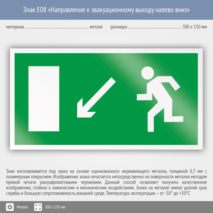 Знак E08 «Направление к эвакуационному выходу налево вниз» (металл, 300х150 мм) в Новом Уренгое купить