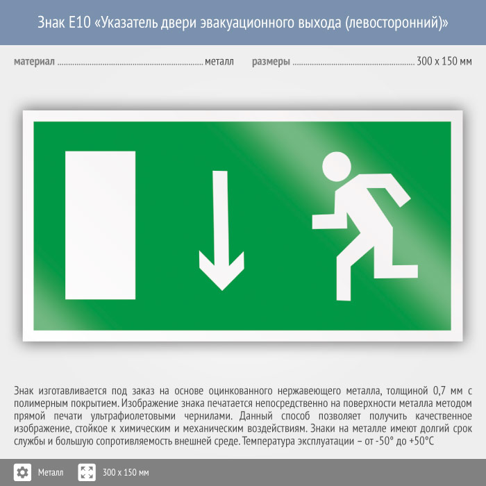 Знак E10 «Указатель двери эвакуационного выхода (левосторонний)» (металл, 300х150 мм) в Новом Уренгое купить