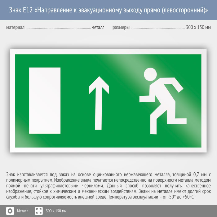Знак E12 «Направление к эвакуационному выходу прямо (левосторонний)» (металл, 300х150 мм) в Новом Уренгое купить