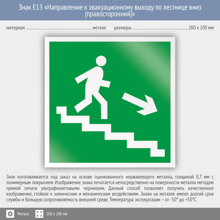 Знак E13 «Направление к эвакуационному выходу по лестнице вниз (правосторонний)» (металл, 200х200 мм) в Новом Уренгое купить
