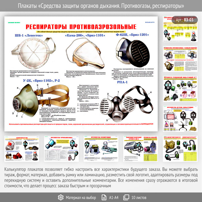 Плакаты «Средства защиты органов дыхания. Противогазы, респираторы» (ВЗ-03, 10 листов) в Новом Уренгое купить