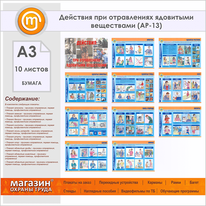 Плакаты «Действия при отравлениях ядовитыми веществами» (АР-13, бумага, А3, 10 листов) в Новом Уренгое купить