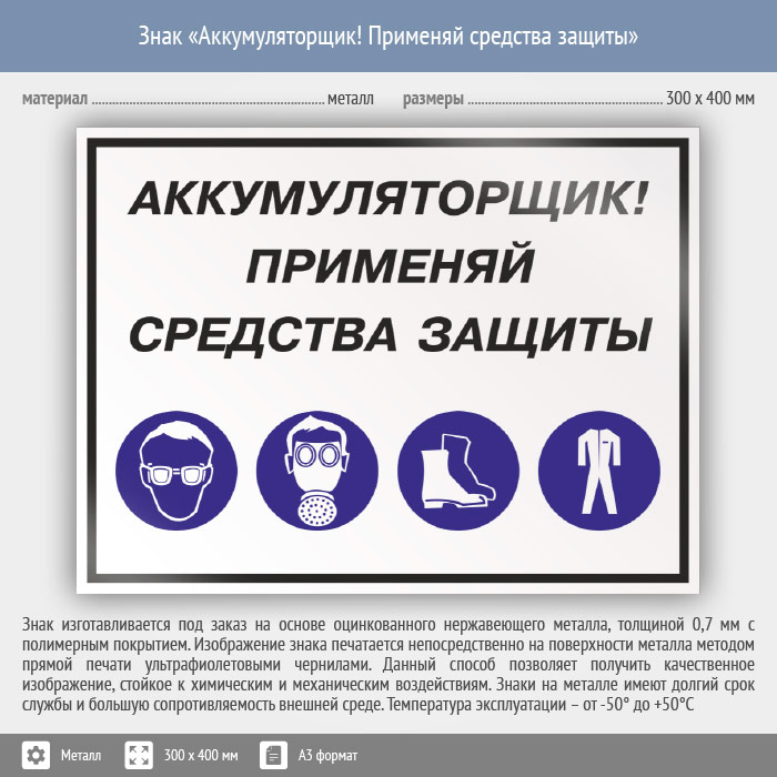 Знак «Аккумуляторщик! Применяй средства защиты», КЗ-02 (металл, 400х300 мм) в Новом Уренгое купить