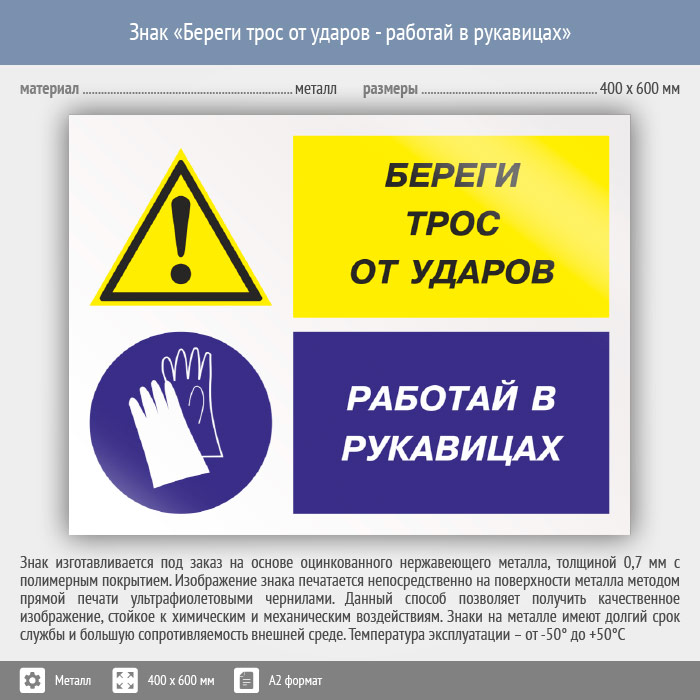 Знак «Береги трос от ударов - работай в рукавицах», КЗ-03 (металл, 600х400 мм) в Новом Уренгое купить