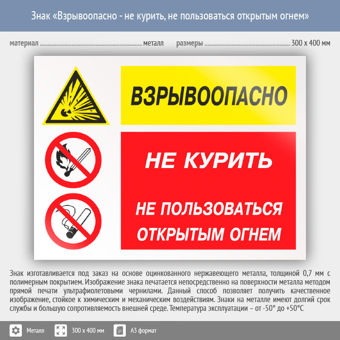 Знак «Взрывоопасно - не курить, не пользоваться открытым огнем», КЗ-05 (металл, 400х300 мм) в Новом Уренгое купить