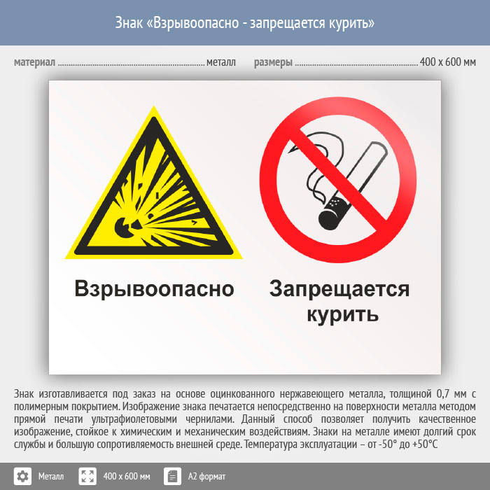 Знак «Взрывоопасно - запрещается курить», КЗ-06 (металл, 600х400 мм) в Новом Уренгое купить