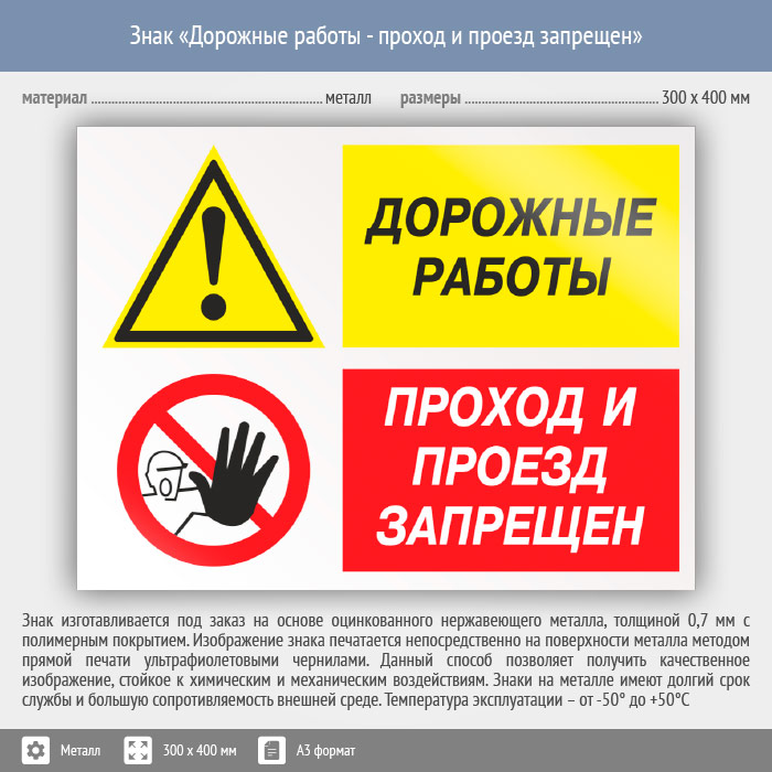 Знак «Дорожные работы - проход и проезд запрещен», КЗ-20 (металл, 400х300 мм) в Новом Уренгое купить