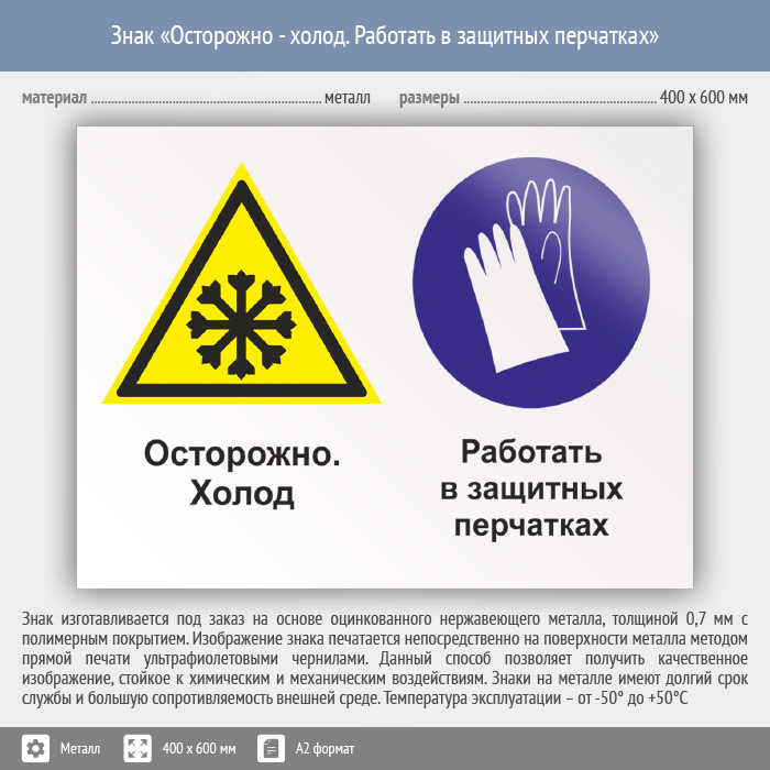 Знак «Осторожно - холод. Работать в защитных перчатках», КЗ-59 (металл, 600х400 мм) в Новом Уренгое купить