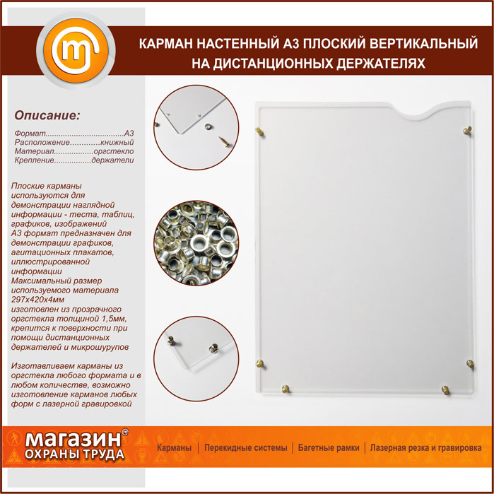 Предлагаем Вашему вниманию настенные плоские вертикальные карманы формата A3 c 3-мя типами крепления – на двустороннем скотче, с бортиками и на дистанционных держателях